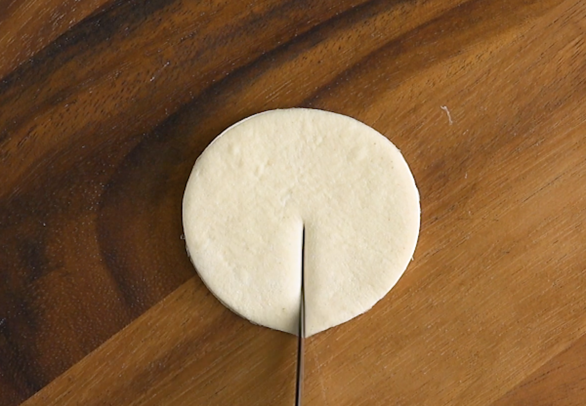 11.1) Stich aus dem ausgerollten Teig 7 Teigkreise mit einem Durchmesser von 6 cm aus und schneide sie jeweils unten einmal bis zur Mitte ein.