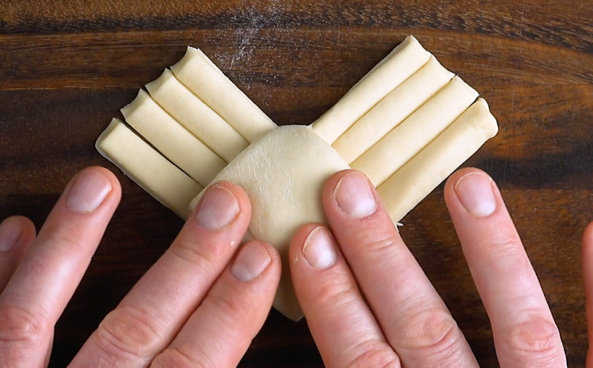 12.1) Schneide aus dem dünn ausgerollten Teig einen Kreis von etwa 26 cm Durchmesser aus. Schneide den Kreis dann von der Mitte ausgehend sternförmig ein. Achte darauf, dass die Schnitte kurz vor dem Rand enden.