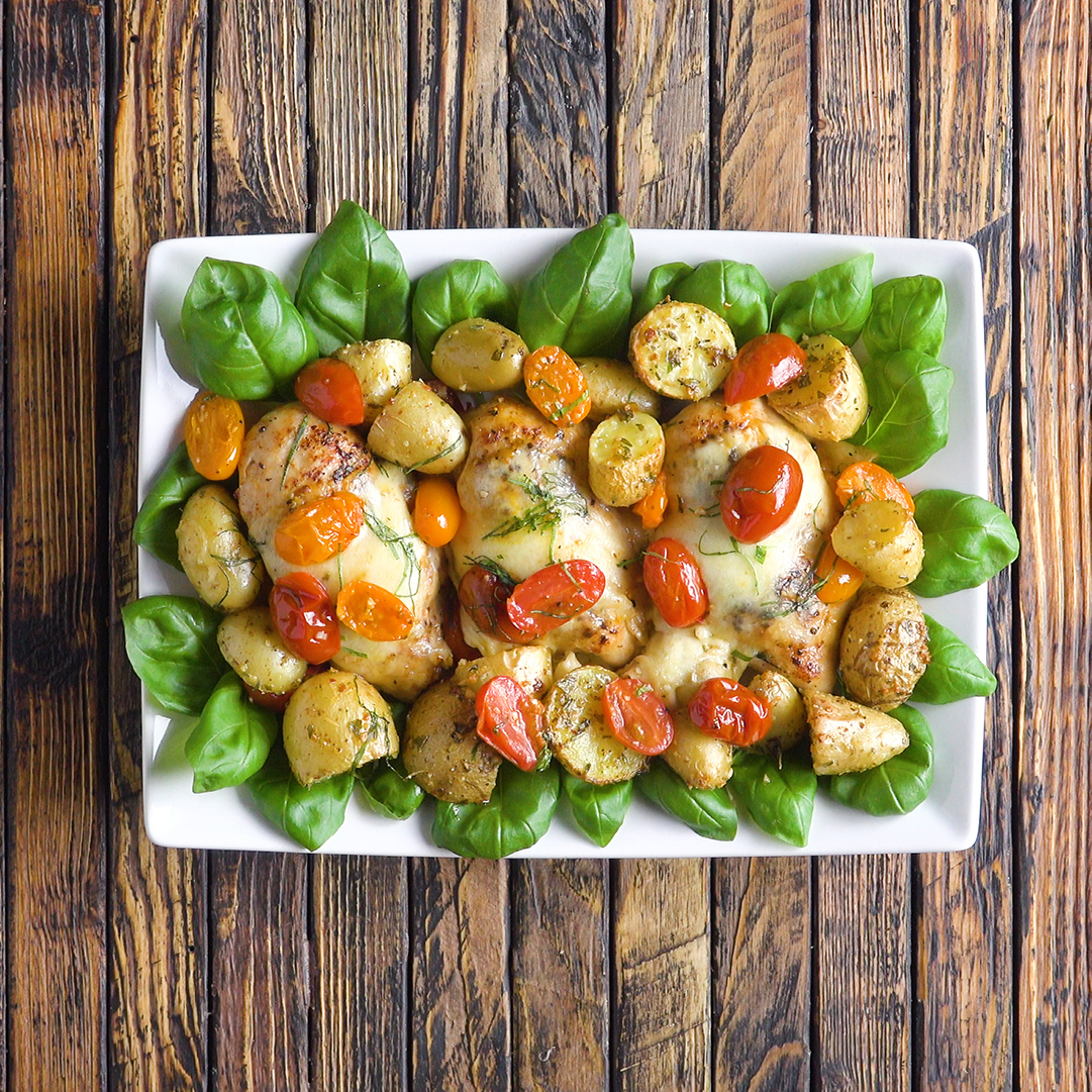 4.) Nun kommt das Blech in den Ofen. Backe das Ganze für 25 Minuten bei 200 °C im Umluftmodus. Tipp: Löse alle Zutaten vorsichtig vom Blech und richte sie auf einer Servierplatte an. Als Verzierung kannst du noch frisches Basilikum um das Gericht herum auf dem Rand der Platte drapieren.