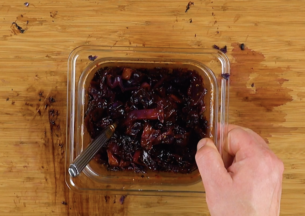 4.) Nimm den Rotkohl vom Grill und dann von der Bierdose herunter. Schneide ihn anschließend komplett klein, gib ihn in eine Schüssel und füge Barbecuesoße hinzu.