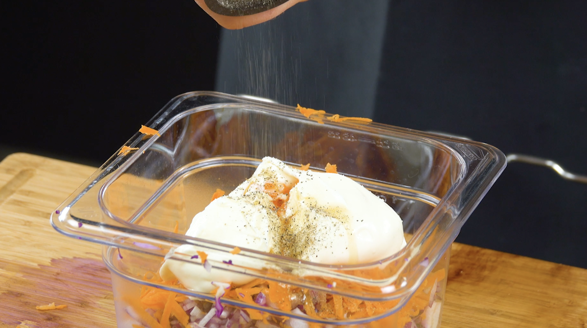 5.) Schneide den anfangs beiseitegelegten Strunk und die Zwiebel klein und gib alles in eine Schüssel. Reibe eine Möhre dazu, gib außerdem Mayonnaise, Apfelessig, Honig, Salz und Pfeffer hinzu und vermenge alles zu einer Gemüsemischung.