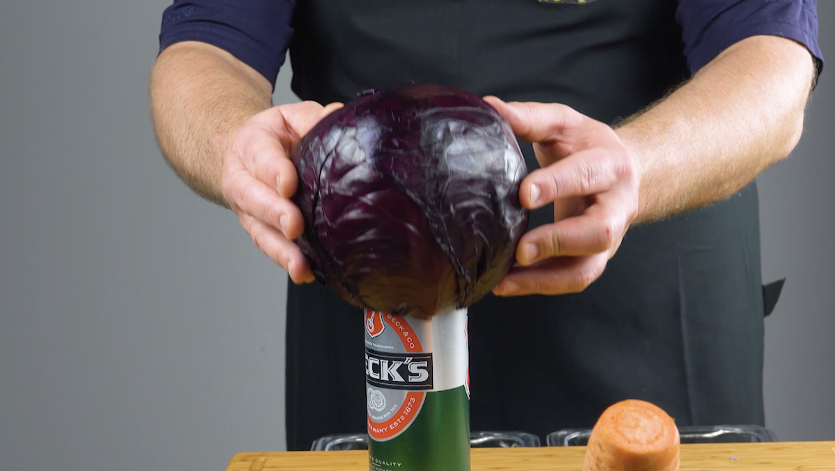 2.) Leere die Bierdose zur Hälfte und stecke den Rotkohl auf die Dose.
