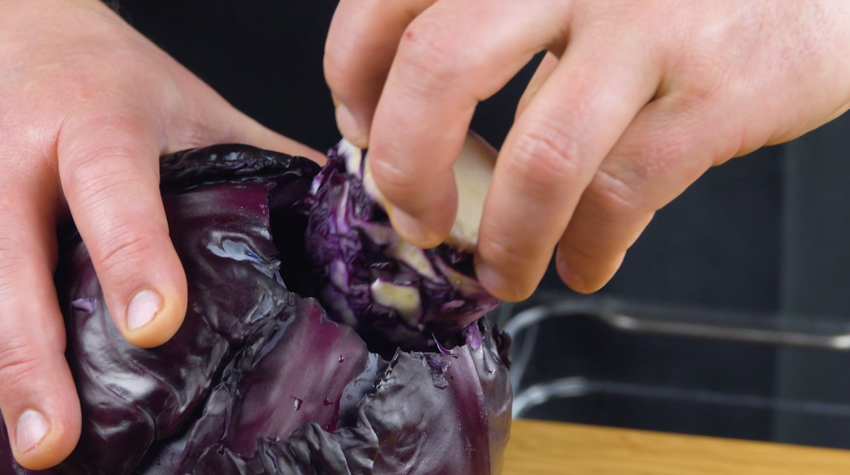 1.) Höhle den Rotkohl aus und lege den Strunk erst einmal beiseite.