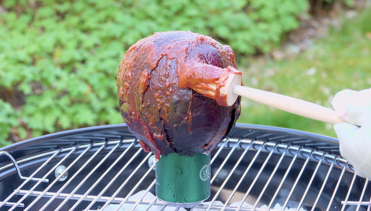 3.) Stelle Dose samt Rotkohl auf den Grill und bestreiche den Kohl mit Barbecuesoße. Grille den Kohl ca. 30 bis 50 Minuten und bestreiche ihn nach 15 Minuten nochmals mit der Barbecuesoße. (Die Grillzeit variiert je nach Größe des Kohls.)