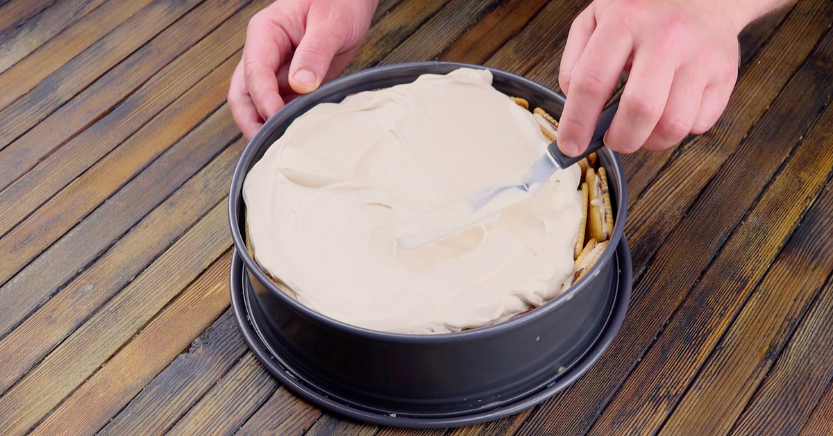 4.) Mit der restlichen Tortencreme füllst du die verbliebenen Lücken zwischen den Keksen auf. Die Oberseite der Butterkeks-Torte wird ebenfalls mit einer Schicht Tortencreme bedeckt. Stelle die Torte für mind. 2 Stunden, am besten aber über Nacht, kalt.