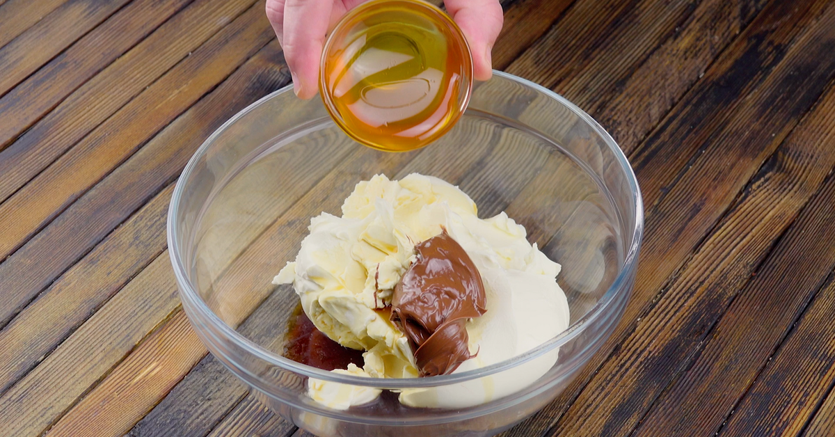 1.) Rühre Frischkäse, Sahne, Nougatcreme, Honig und Kaffee zu einer gleichmäßigen hellen Tortencreme. Die Erdbeeren schneidest du in Scheiben.