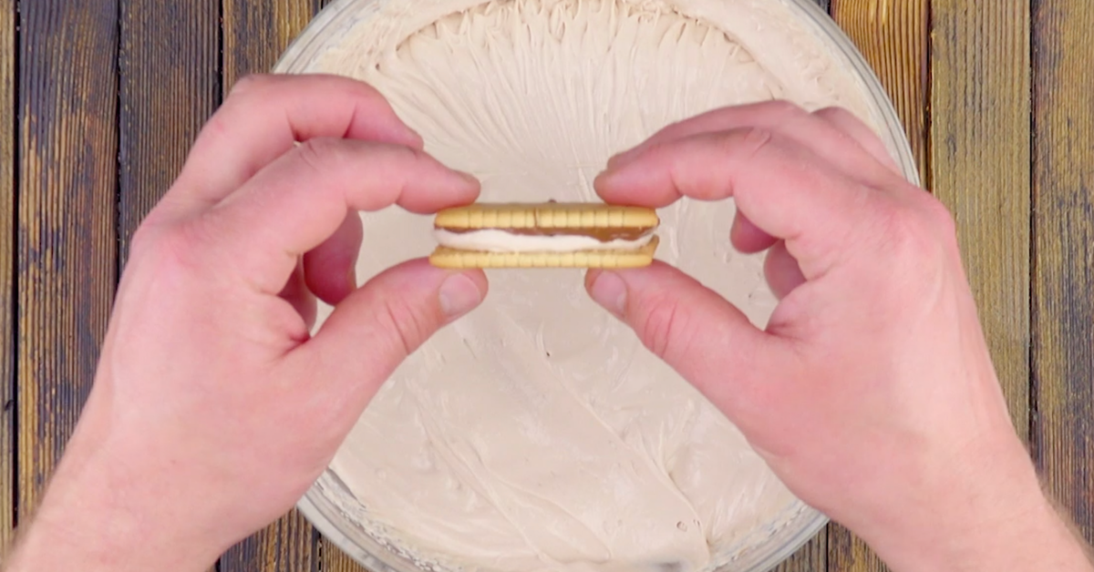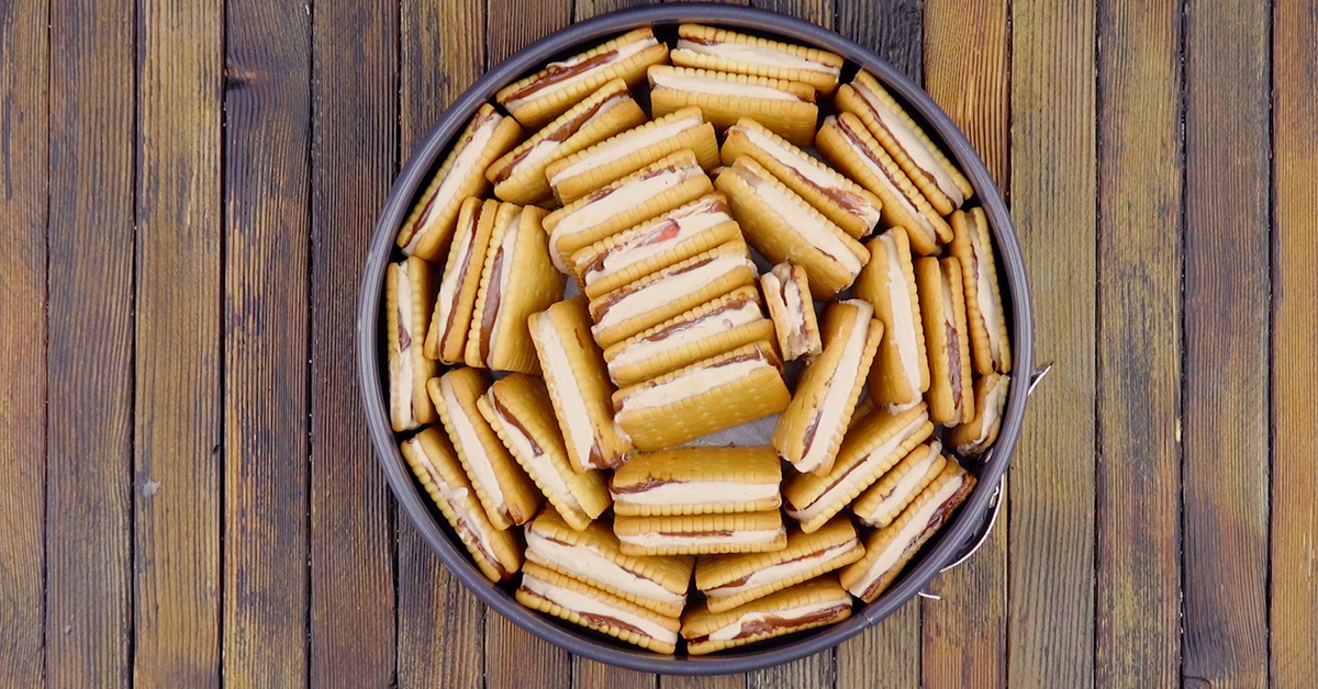 3.) Tauche diesen „Keks-Sandwich“ kurz in kalten Milchkaffee und stelle ihn hochkant in eine Springform. Mache nun so viele in Milchkaffee getauchte „Keks-Sandwichs“, dass sie dicht an dicht die Springform füllen.