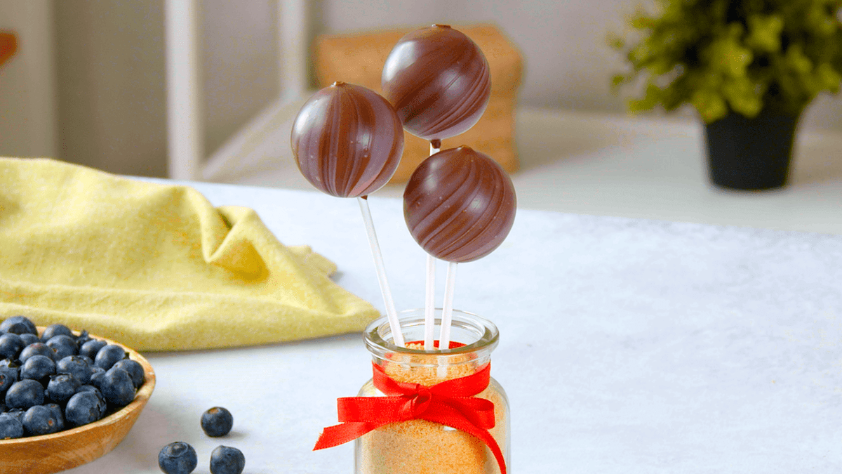 3. Fülle die geschmolzene Schokolade in eine Schüssel und erzeuge obendrauf ein Gitter aus geschmolzener Ruby Schokolade. Führe dann die Cheesecake Pops langsam drehend in die Schokolade ein und ziehe sie genauso wieder heraus. (Für jeden Cheesecake Pop musst du ein neues Gitter aus Ruby-Schokolade erzeugen.)