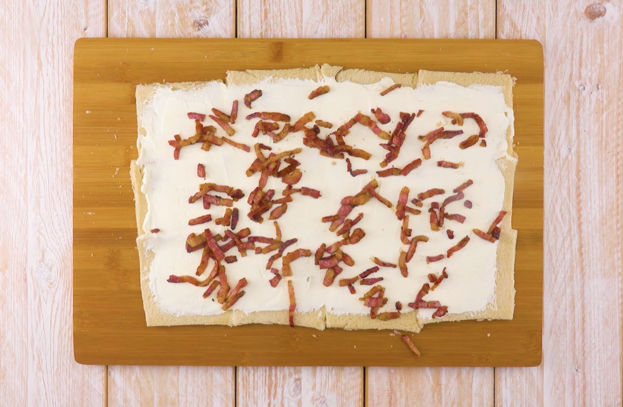 1.) Schneide für die Rolle zunächst die Kanten der Toasts ab und lege sie in einem Rechteck (am besten im Verhältnis 3 zu 4) leicht überlappend auf deine Arbeitsfläche. Walze sie mit einem Nudelholz platt und bestreiche die gesamte Fläche gleichmäßig mit Crème fraîche.
