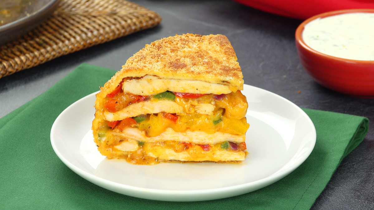 Textmex aus der Kuchenform! Panierter Chicken Fajita Kuchen mit marinierter Hähnchenbrust, Cheddar und angebratener Paprika. Würzig und sehr lecker!