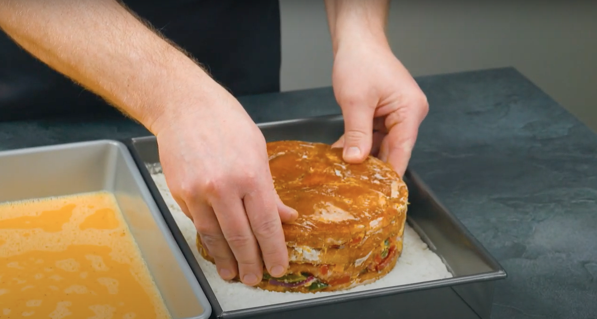 7. Nimm die Kuchenform aus dem Gefrierfach und ziehe die Klarsichtfolie vom Kuchen ab. Gib Acht, dass das Fleisch von außen tiefgefroren ist, damit es zum Panieren stabil genug ist. Bereite die Eier für das Panieren vor, indem du sie verrührst und mit Salz und Pfeffer würzt. Stelle dir dann eine Schüssel mit dem Mehl und eine weitere mit dem Panko-Paniermehl bereit und paniere den gefrorenen Chicken-Fajita-Kuchen, indem du ihn zuerst im Mehl, dann im Ei und schließlich im Panko-Mehl wälzt.