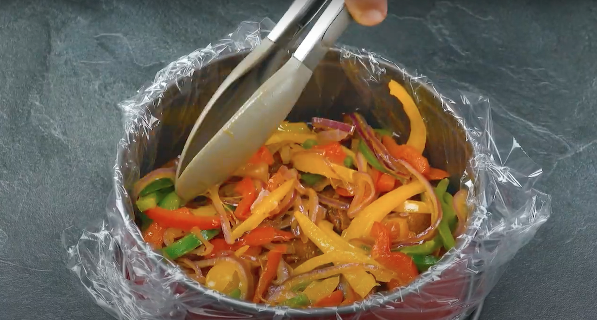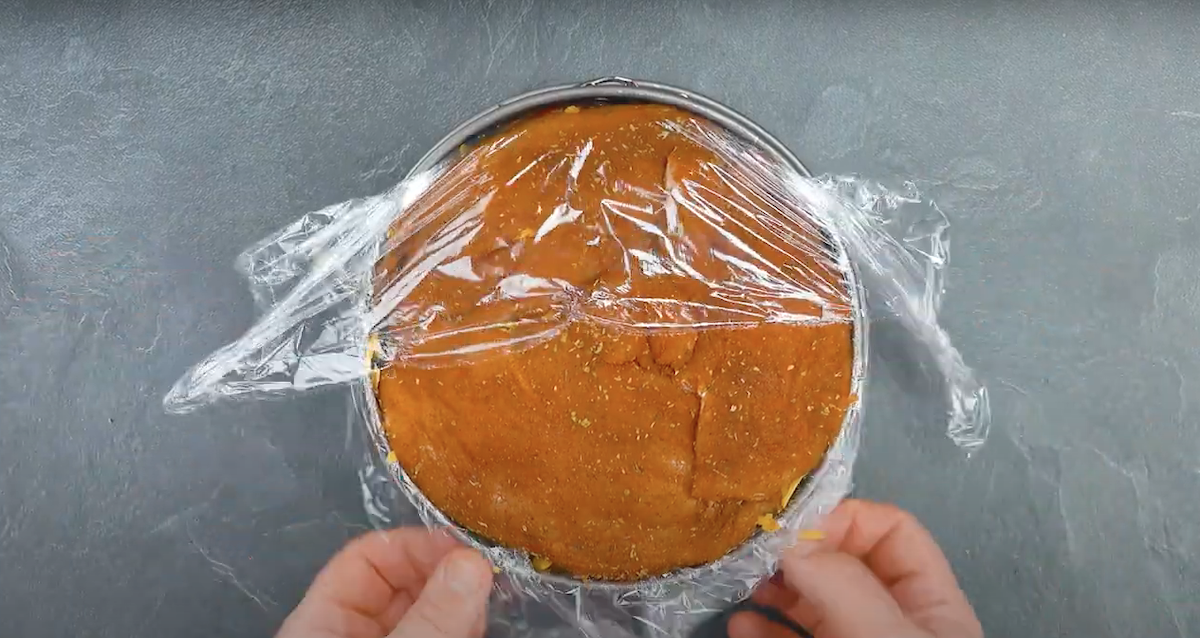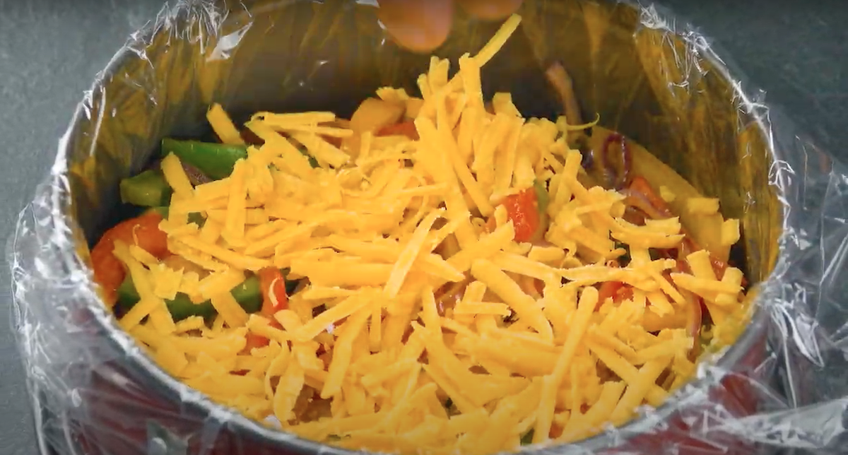 6. Wiederhole diese 3 Schichten – marinierte Hähnchenfilets, gebratenes Gemüse und Cheddar –, bis alle Zutaten aufgebraucht sind und die Kuchenform schön gefüllt ist. Achte darauf, dass du das Schichten mit einer Fleischschicht abschließt, und decke den Chicken-Fajita-Kuchen mit Klarsichtfolie ab. Gib die Springform für 2 Stunden ins Gefrierfach.