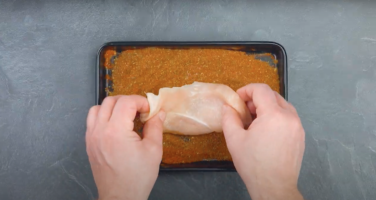 1. Gib Cayennepfeffer, Salz, Kreuzkümmel, Oregano, schwarzen Pfeffer und Paprikapulver in eine Schüssel und vermische alles miteinander. Schneide die Hähnchenbrüste mit einem Messer zweimal längs durch, sodass flache Filetscheiben entstehen, und wälze diese in der Gewürz-Marinade.