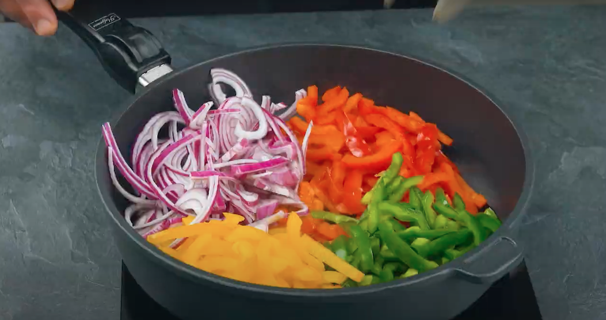 2. Schneide 2 gelbe, 2 rote und 2 grüne Paprikas und 2 rote Zwiebeln in Streifen und brate sie in einer Pfanne in Pflanzenöl an.