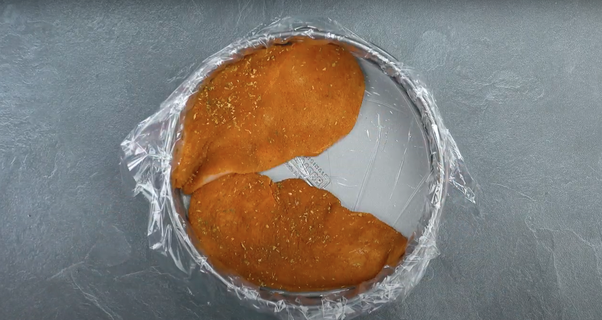 3. Lege die Kuchenform mit Klarsichtfolie aus und lege eine Schicht marinierte Hähnchenbrust-Filets in die Springform.