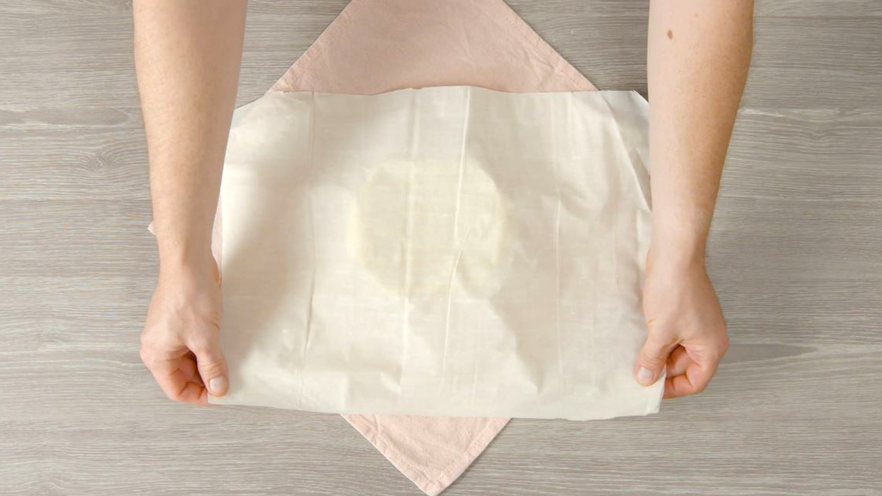 2. Lege zunächst 3 Filoteigblätter übereinander und platziere sie mittig auf der kleinen Form.