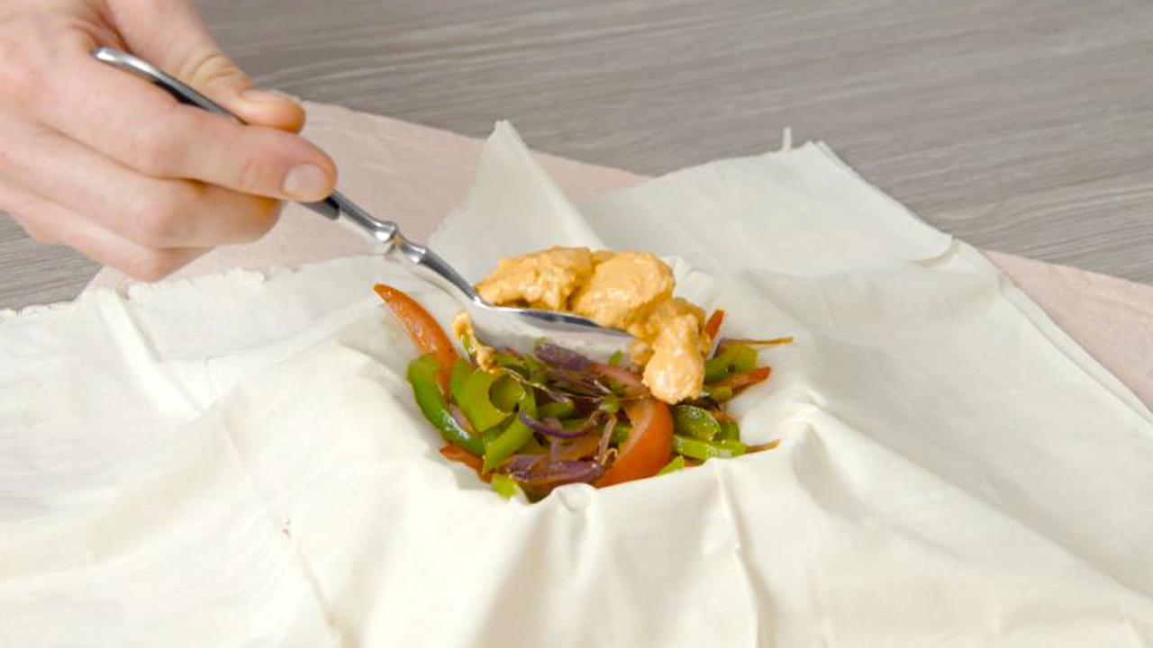 4. Brate das Hähnchen samt Marinade kurz scharf in einer Pfanne an und befülle den Filoteig neben dem Gemüse nun auch mit dem Kebab-Hähnchen. Es muss nicht vollständig durchgegart sein, da es später noch in den Ofen kommt.