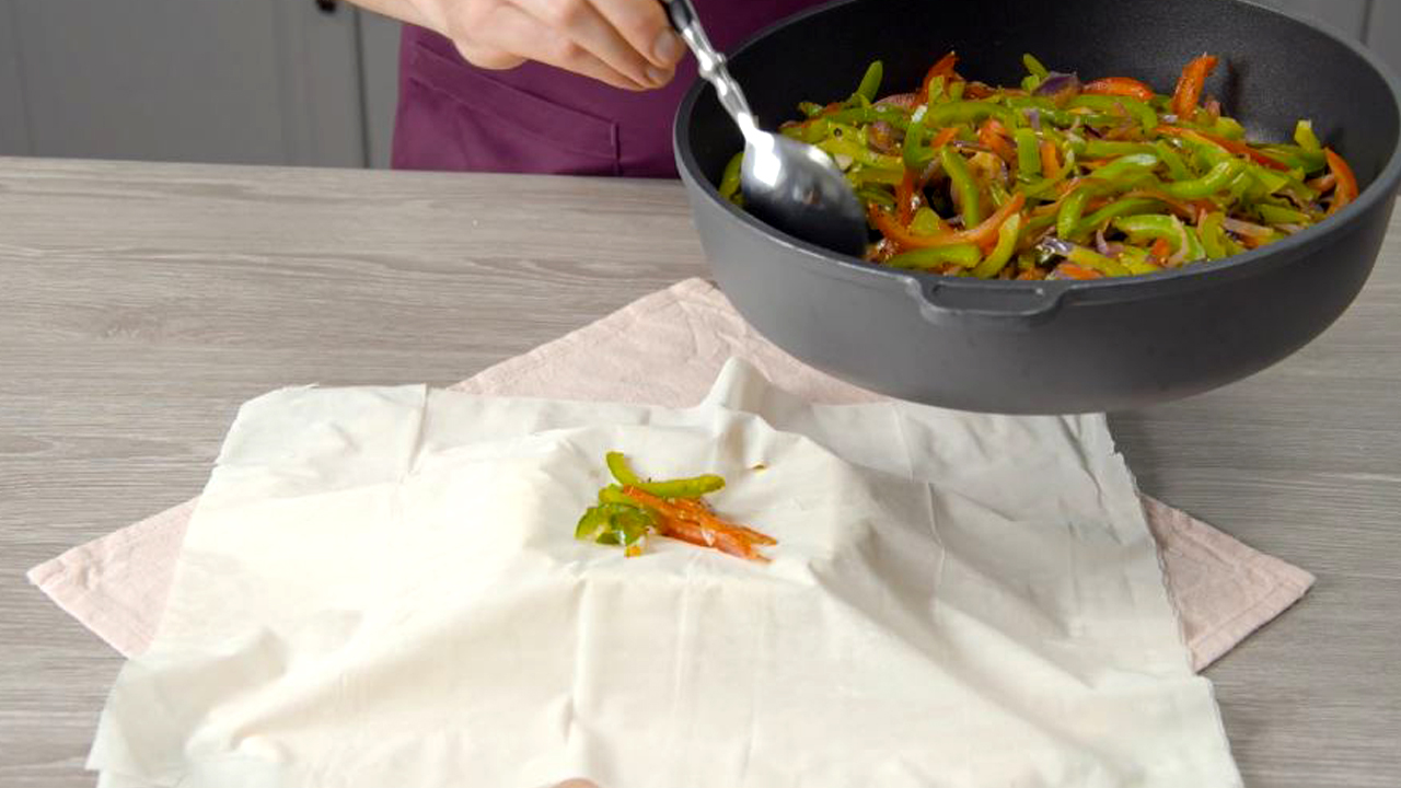 3. Brate nun das Gemüse mit etwas Öl kurz in einer Pfanne scharf an und würze es mit Salz und Pfeffer. Befülle den Filoteig dann zur Hälfte mit Gemüse.