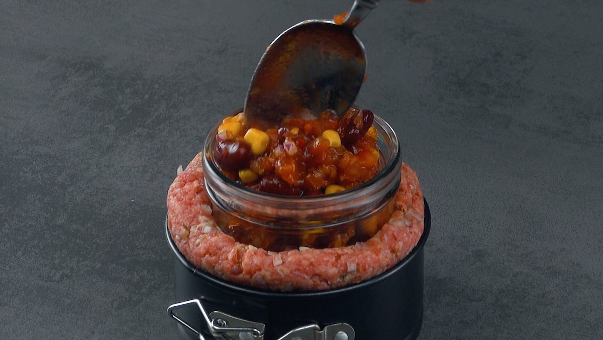 3. Schiebe das Chili con Carne dann für eine halbe Stunde bei 160 °C Umluft in den Ofen. Entferne dann vorsichtig die Springformen, ziehe die Gläser heraus und fülle das Chili in die Carne.
