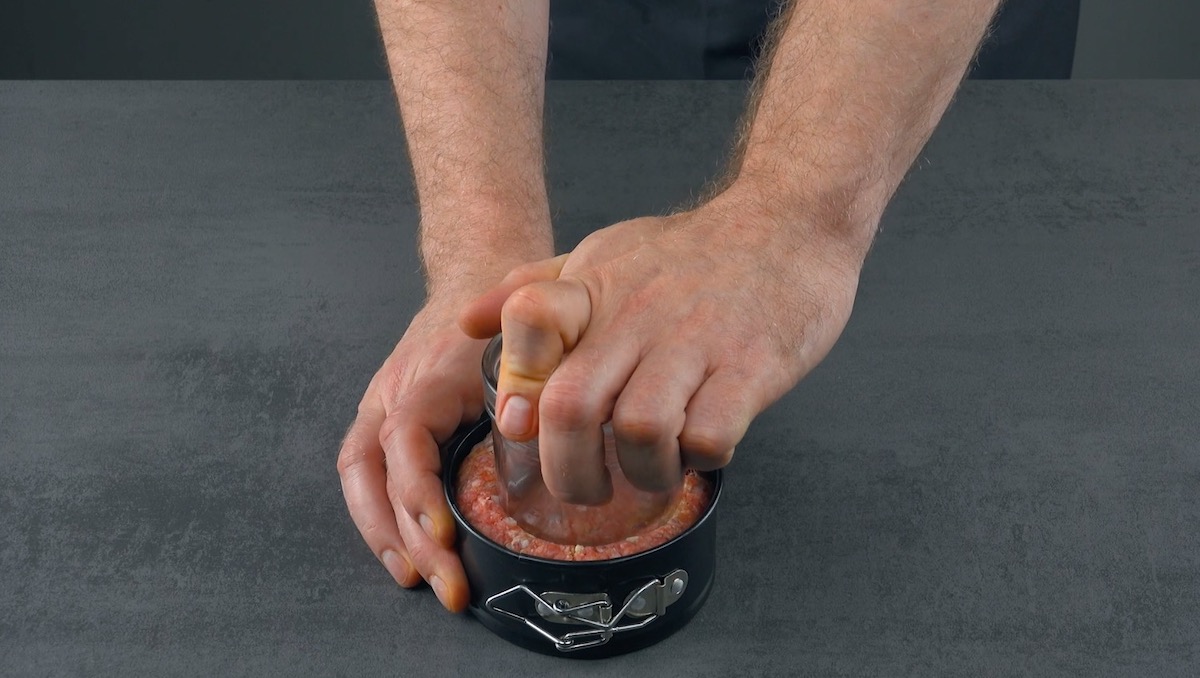 1. Vermische alle Zutaten für das Hackfleisch miteinander. Teile das Hackfleisch dann auf die zwei bereits eingeölten, kleinen Springformen auf und drücke je ein Glas in die Fleischmassen, sodass eine tiefe Mulde entsteht. Öle die Gläser am besten vorher ein, damit sie sich später leichter entfernen lassen.