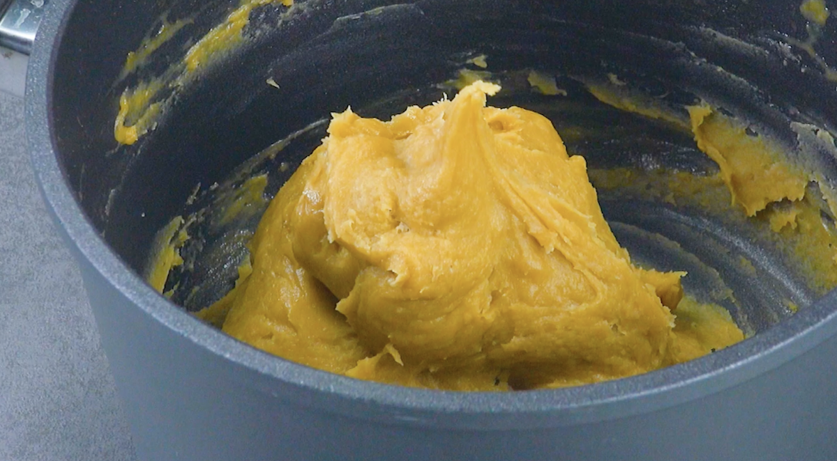1. Gib Butter, Zucker und Wasser in einen Topf und lasse alles aufkochen. Füge Mehl hinzu und verrühre alles mit einem Holzlöffel, bis der Teig glatt ist und sich von allein von der Topfwand löst. Wenn der Teig leicht abgekühlt ist, gib das Vanillearoma und ein Ei nach dem anderen unter die Brandmasse.