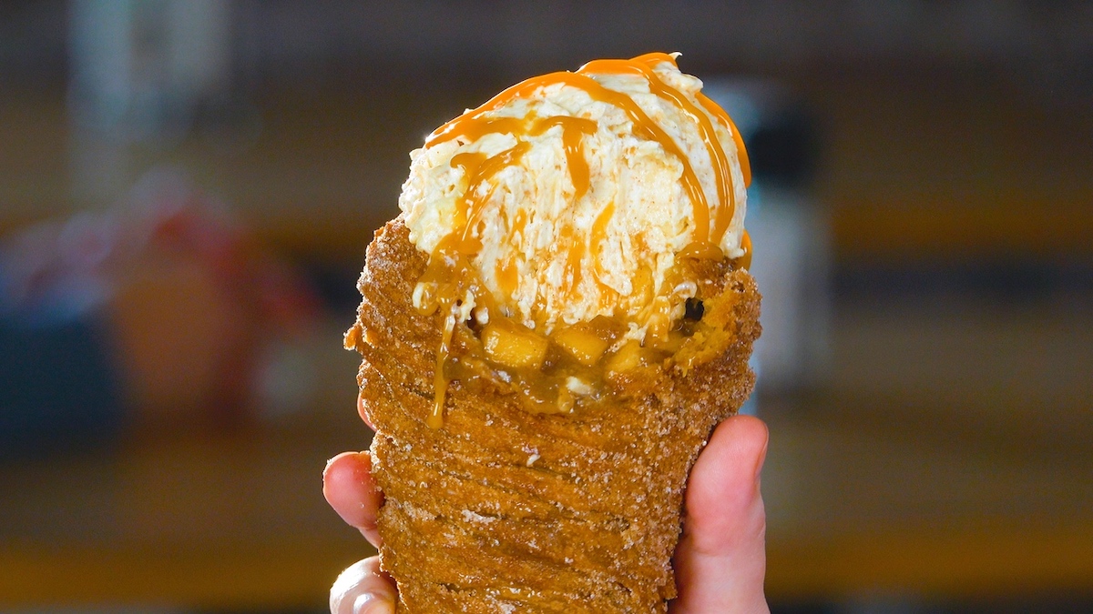 3. Wenn die Churro-Tüte gefroren ist, entferne das Partyhütchen und frittiere das Gebäck in heißem Fett, bis es goldbraun ist. Lasse die Churro-Tüte auf etwas Küchenpapier abtropfen und wälze sie dann in Zimt und Zucker.