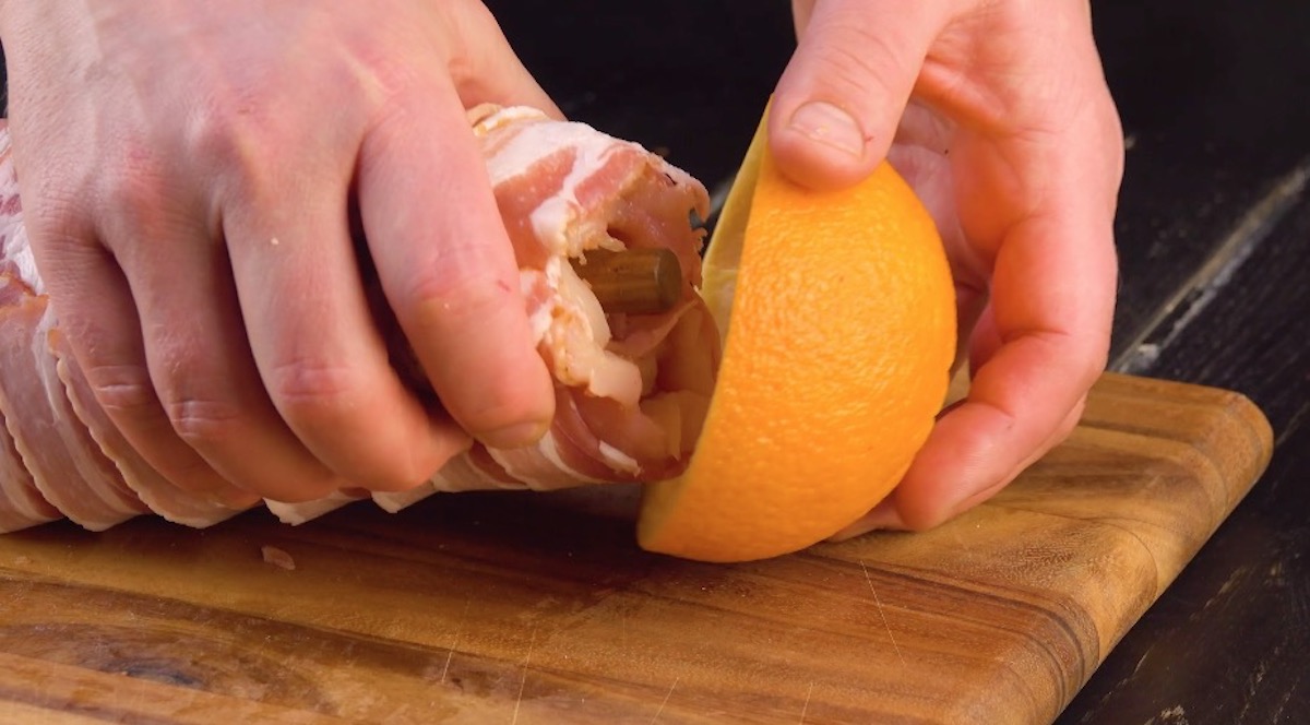 6.) Wickle 16 Scheiben Frühstücksbacon um die Fleischrolle herum und stecke die beiden Orangenschalen, die aus Schritt 3 übrig geblieben sind, links und rechts auf den Kochlöffel, der aus der Fleischrolle herausragt.