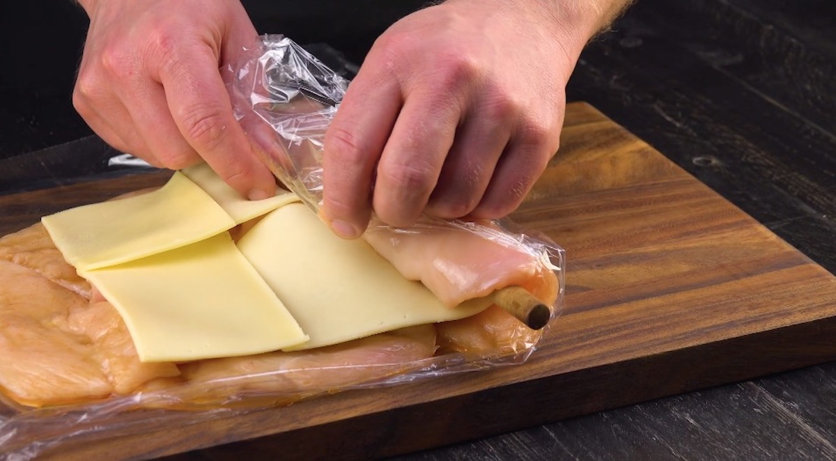1.) Schneide die Hähnchenbrüste in der Mitte längs auf und klappe sie auseinander. Lege Frischhaltefolie auf sie und plätte das Fleisch mit einem Fleischklopfer.