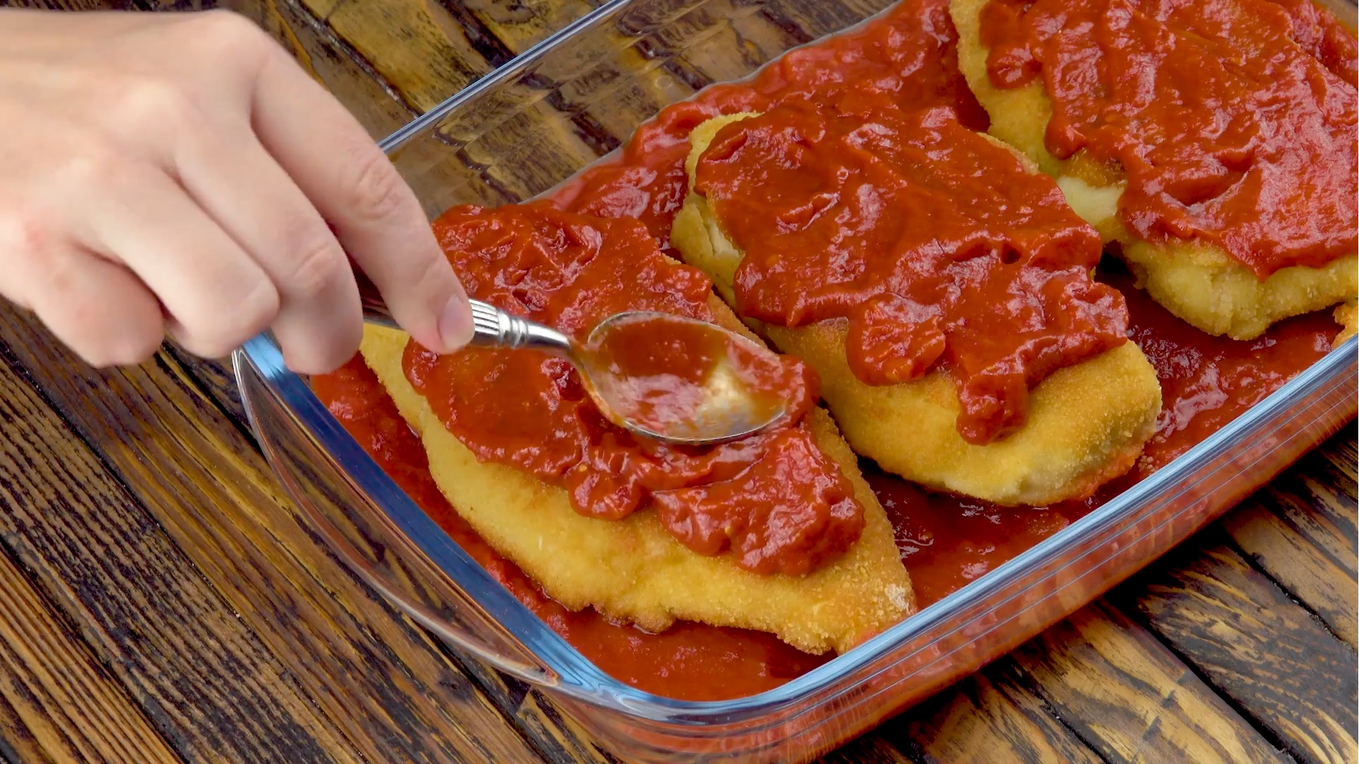4.) Befülle eine Auflaufform mit rund drei Vierteln der Tomatensoße und lege darauf die gebratenen Hühnerbrüste. Streiche die übrige Tomatensoße aufs Fleisch.