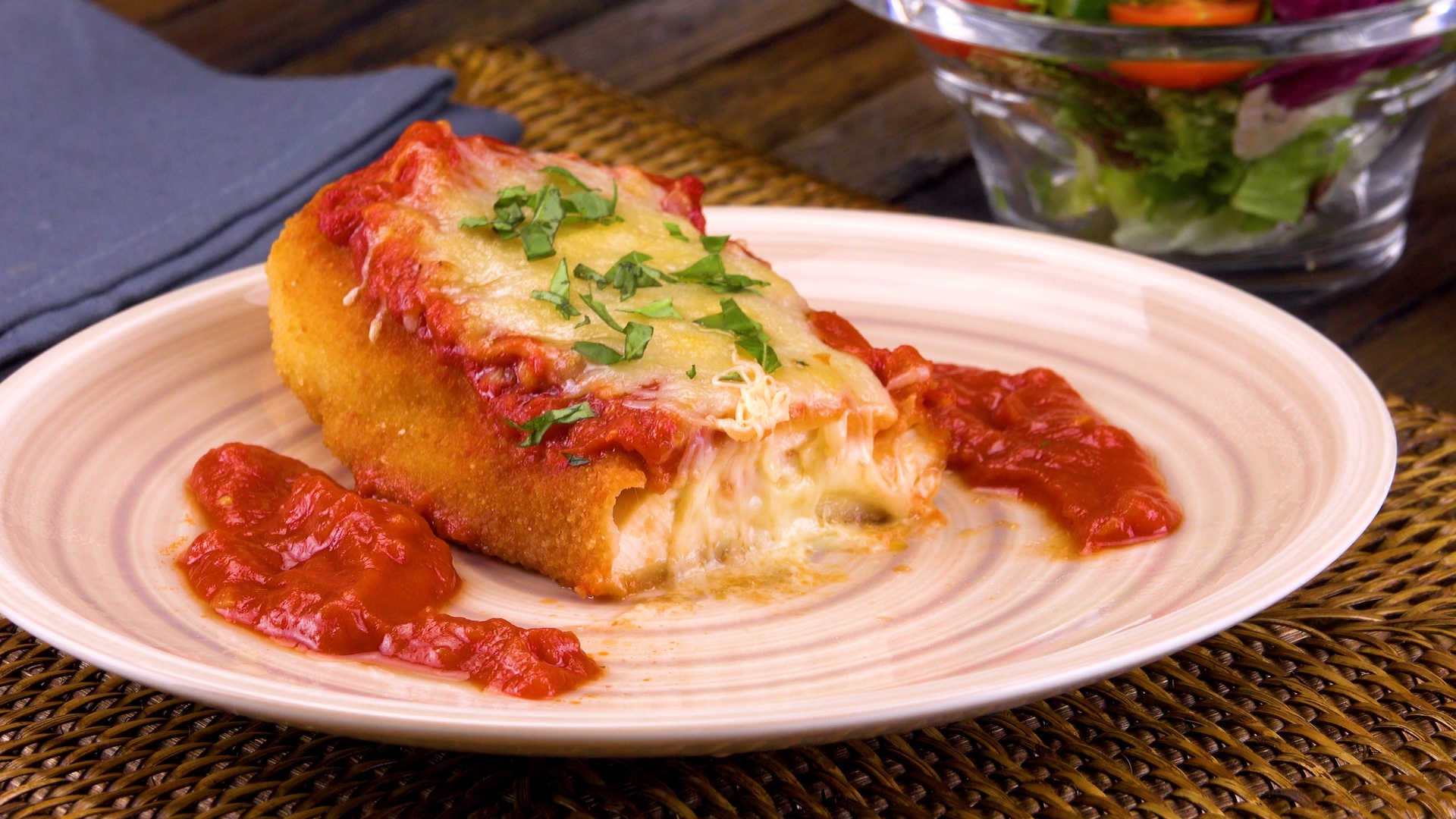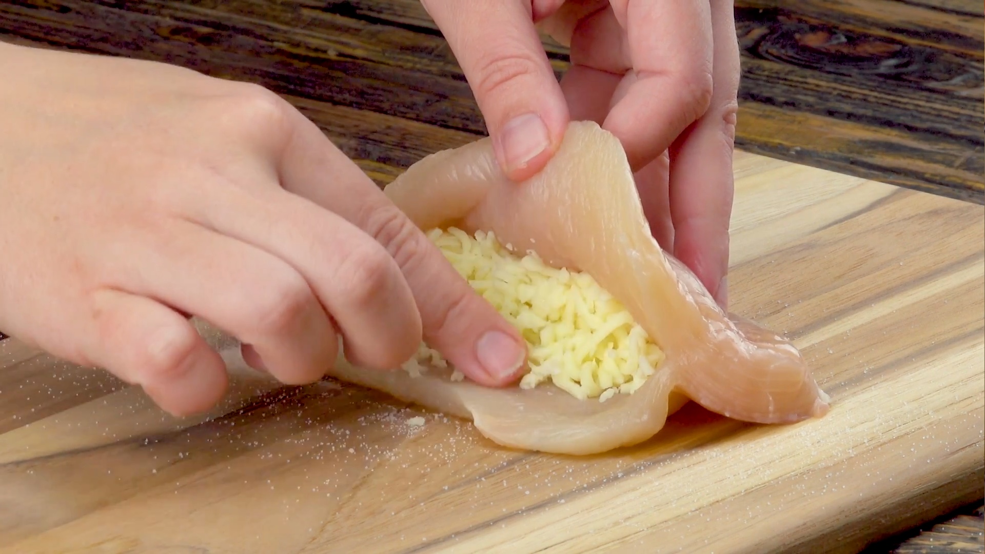 1.) Streue deinen Arbeitsbereich mit Salz aus. Platziere eine Hühnerbrust darauf, streue auch auf deren Oberseite etwas Salz und schneide eine Tasche ins Fleisch. Fülle diese Tasche mit Mozzarella aus und drücke das Fleisch anschließend fest zusammen. Befülle so auch die übrigen Hühnerbrüste.