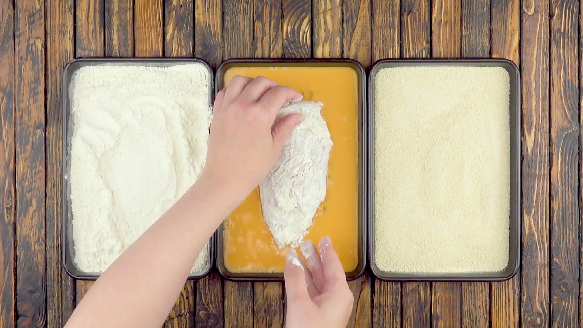 2.) Wälze die gefüllten Hühnerbrüste in reichlich Mehl, Ei und zum Schluss in Semmelbröseln. Achte darauf, eine geschlossene Schicht Panade zu erzeugen. Bei Bedarf wiederhole die Arbeitsschritte einfach.