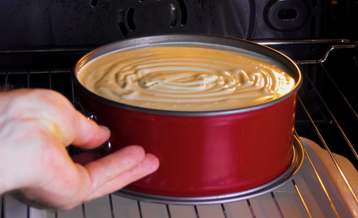 6.) Schiebe den Kuchen in den auf 175 °C vorgeheizten Ofen (Ober- und Unterhitze; mittlerer Ofenrost) und stelle zudem eine Schale mit heißem Wasser auf den Boden des Backofens. Backe den Kuchen nur für 10 Minuten. Reduziere dann die Temperatur auf 120 °C und backe den Kuchen weitere 90 Minuten. Lasse den Kuchen danach bei Raumtemperatur abkühlen. Am besten stellst du den Kuchen über Nacht in den Kühlschrank.