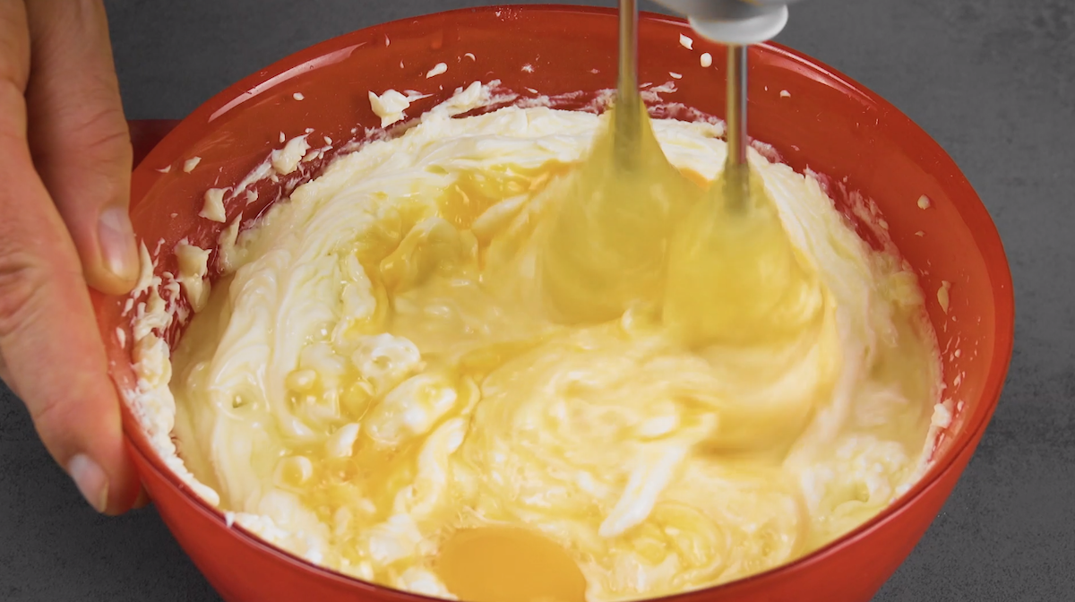 4.) Gib Frischkäse, Zucker und Stärkemehl in eine Schüssel und verrühre alles mit einem Handrührgerät. Schlage nach und nach 4 Eier sowie ein weiteres Eigelb hinein.