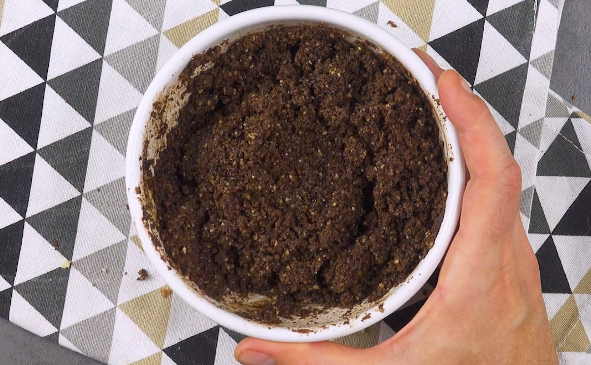 2.) Gib die Kekskrümel nun zu den Nüssen und füge noch Kakaopulver und die geschmolzene Butter hinzu. Vermenge alles miteinander.