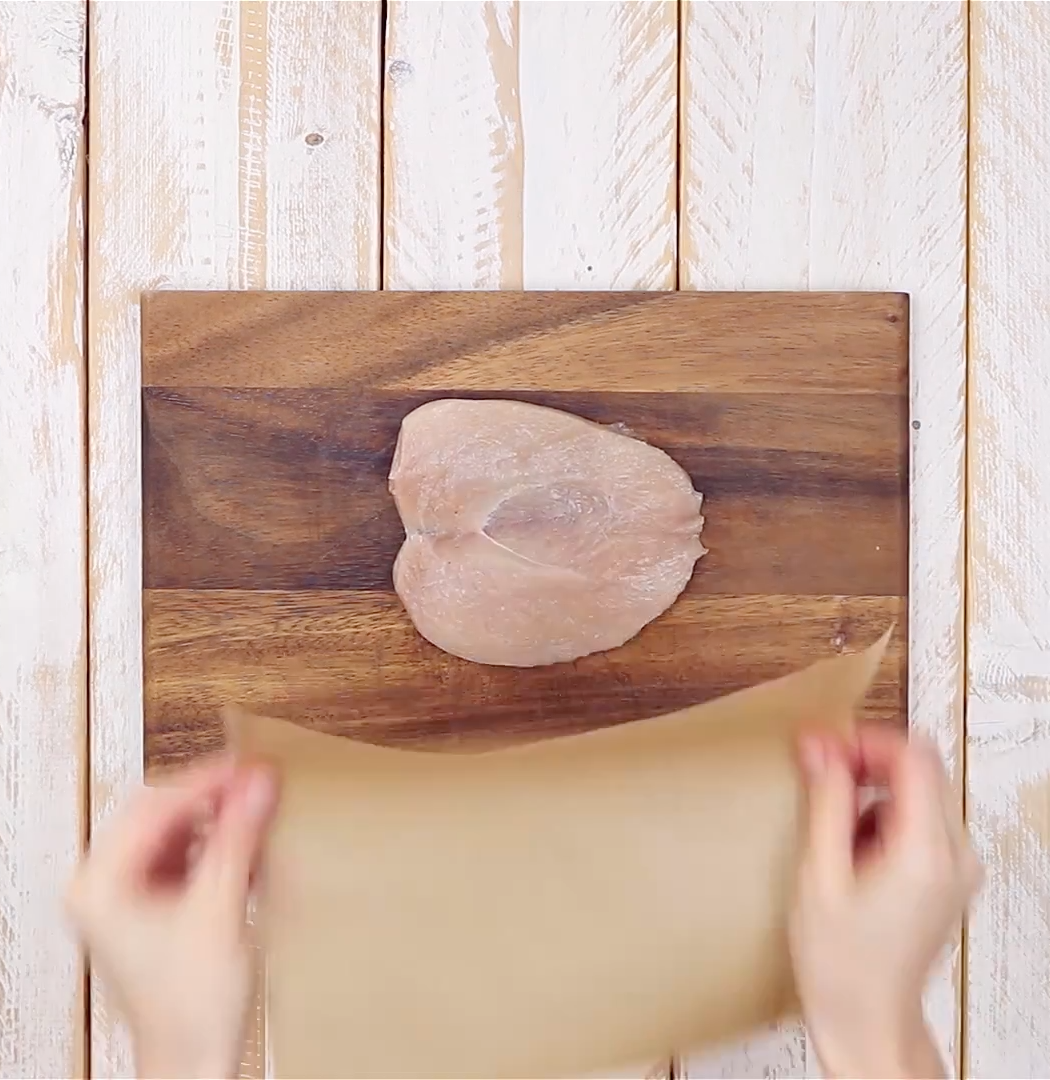 Trenne die Hähnchenbrüste so auf, dass sich sich aufklappen lassen. Lege ein Stück Backpapier auf die aufgeklappte Brust und schlage sie mit einer Pfanne flach.