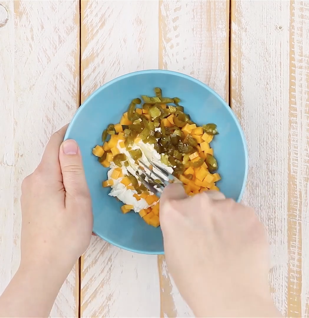 In einem Schälchen mischst du Frischkäse, Cheddar und Jalapeños zu einer Creme.