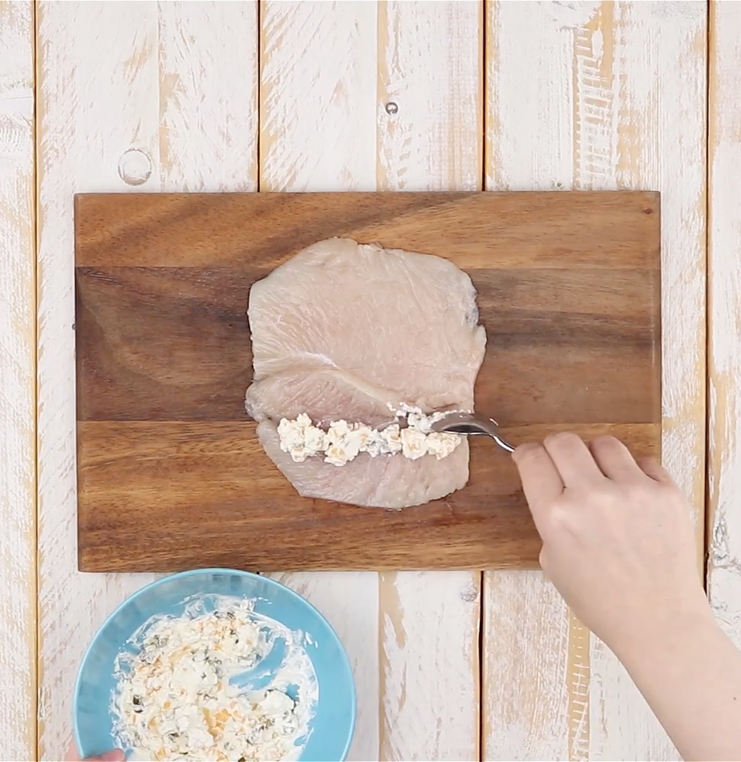 Diese gibst du in einem dünnen Streifen auf die flachen Hähnchenbrüste.
