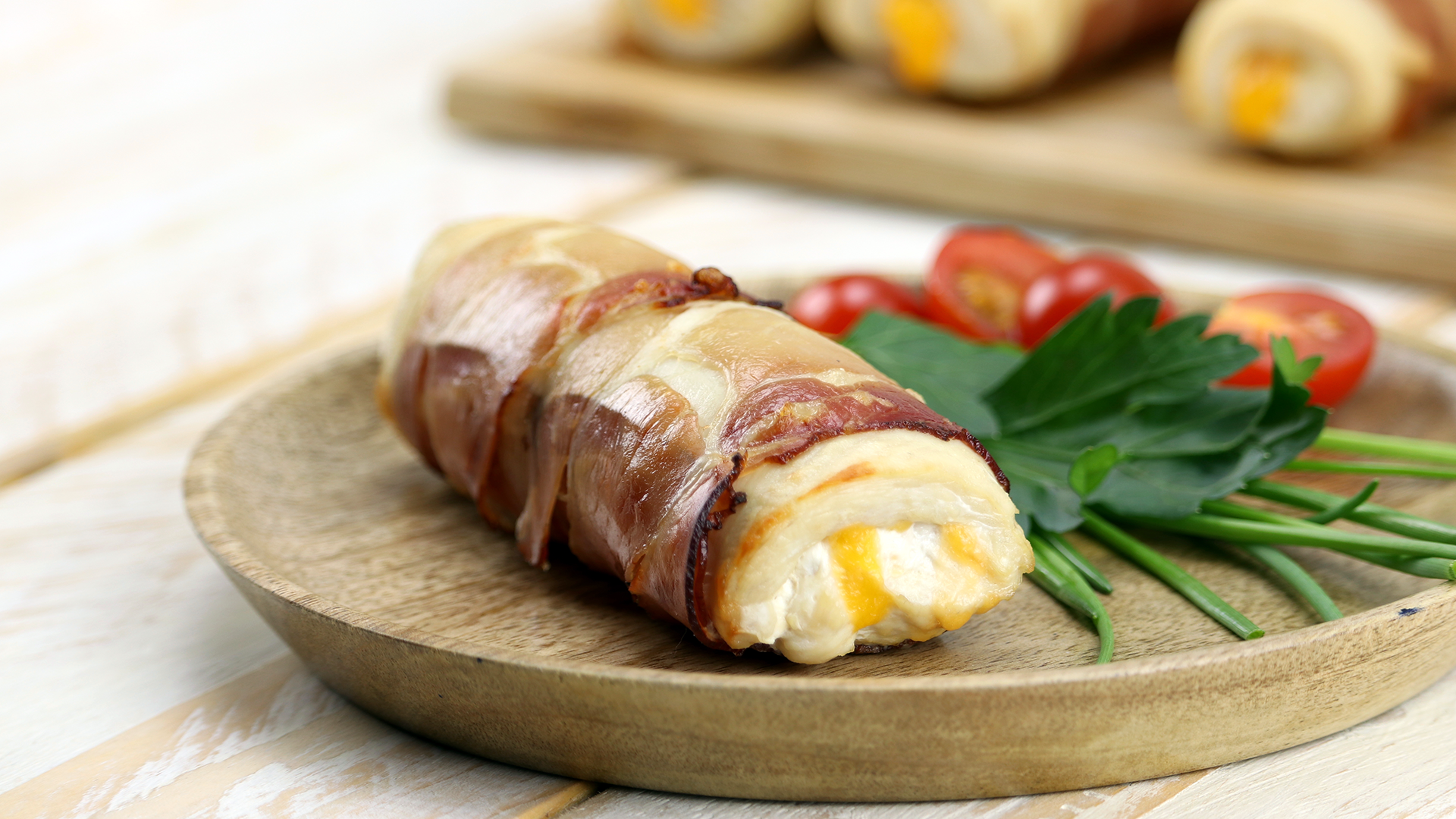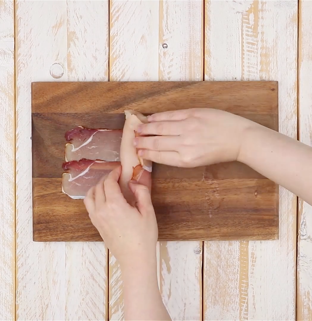 Rolle die Brüste fest zusammen und ummantele sie dann noch mit jeweils zwei Scheiben Schinken, indem du die Brüste mit ihnen einrollst.