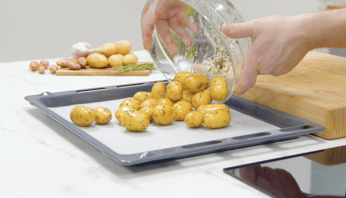 2. Für die Rosmarinkartoffeln wäschst du die Kartoffeln und lässt sie abtropfen. Gib sie in eine Schüssel und würze sie mit grobem Salz und Rosmarin. Benetze die Kartoffeln mit Öl (gerne auch mit Knoblauchöl). Vermenge alles miteinander und verteile die Kartoffeln auf einem Backblech mit Backpapier. Schieb das Blech mit zu dem Fleisch in den Ofen (die Kartoffeln brauchen ca. 35 Minuten).