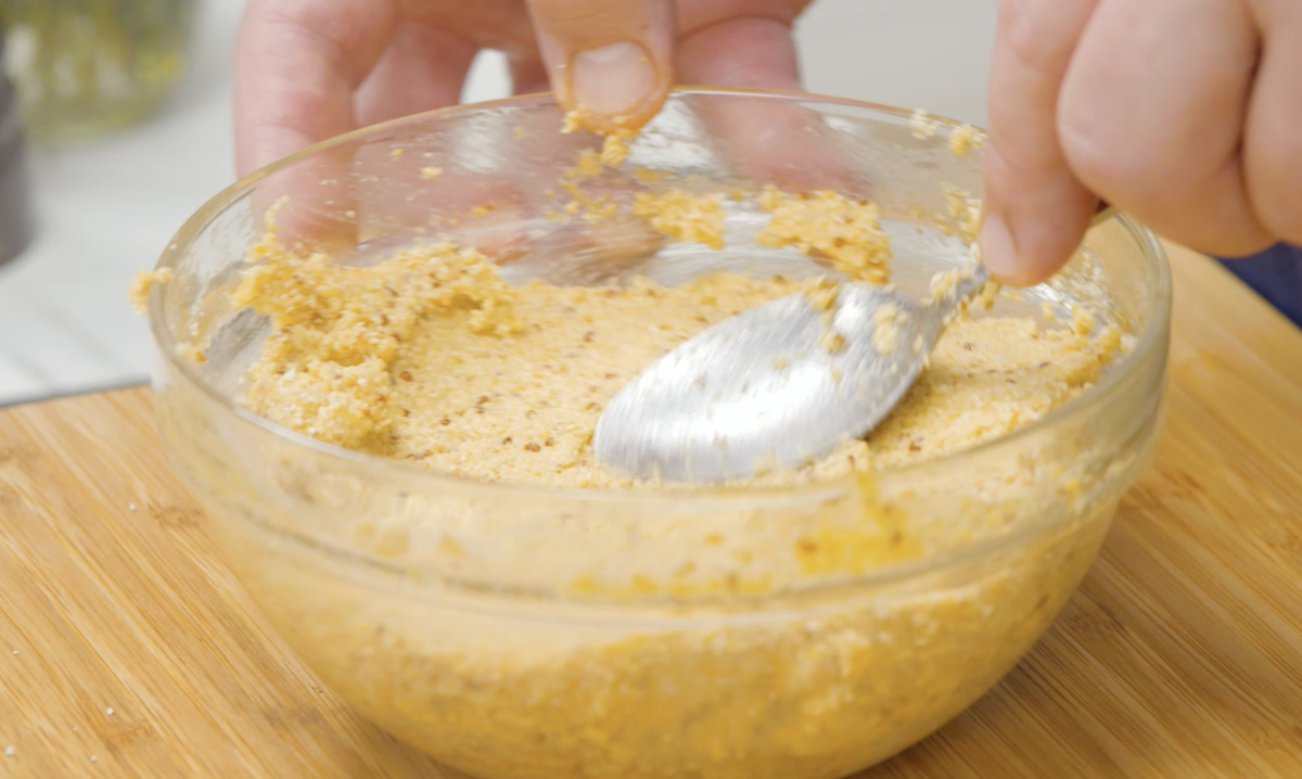 4. Für die leckere Kruste machst du Folgendes: Gib die Fenchelsamen aus einem Teebeutel in eine Schüssel und füge weiche Butter, Eigelb, Honig, Senf, gemahlene Haselnüsse und Semmelbrösel hinzu. Verrühre alles miteinander. Stelle die Mischung für mindestens 20 Minuten kalt.