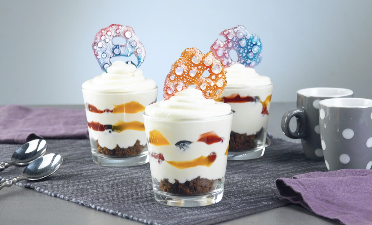 4.4 Löse die Zucker-Kuppel von der Folie und dekoriere das gewünschte Dessert damit.