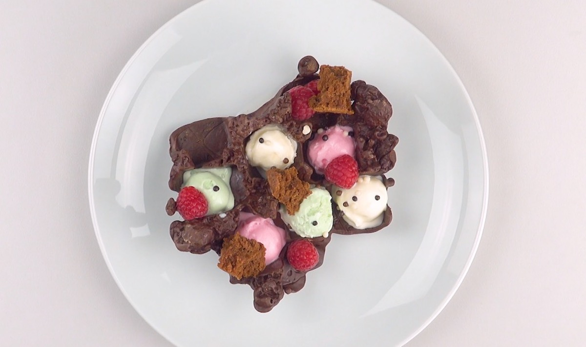 2.) Schokoeiswürfel Gib Eiswürfel in eine Auflaufform oder Schüssel und gieß die temperierte Schokolade darüber. Sobald sie getrocknet ist, kannst du die fertige Schokoladen-Form vom Eis lösen. Perfekt für Eiskugeln, kleine Kuchenstückchen, Kekse oder Obst.