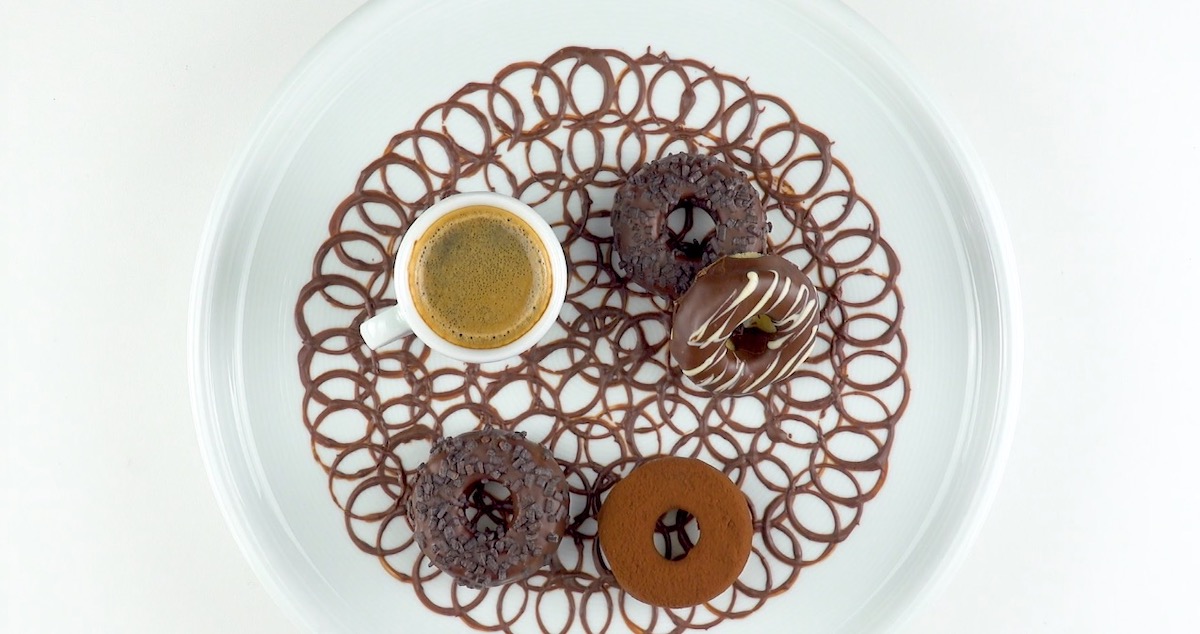 Benutze für dieses Mandala eine Spritztülle oder eine ähnliche Form. Tunke diese in dunkle geschmolzene Schokolade und drücke die Form dann kreisförmig nebeneinander auf den zu verzierenden Teller. Lasse die Kreise fest werden und fertig ist der Teller zum weiteren Garnieren.
