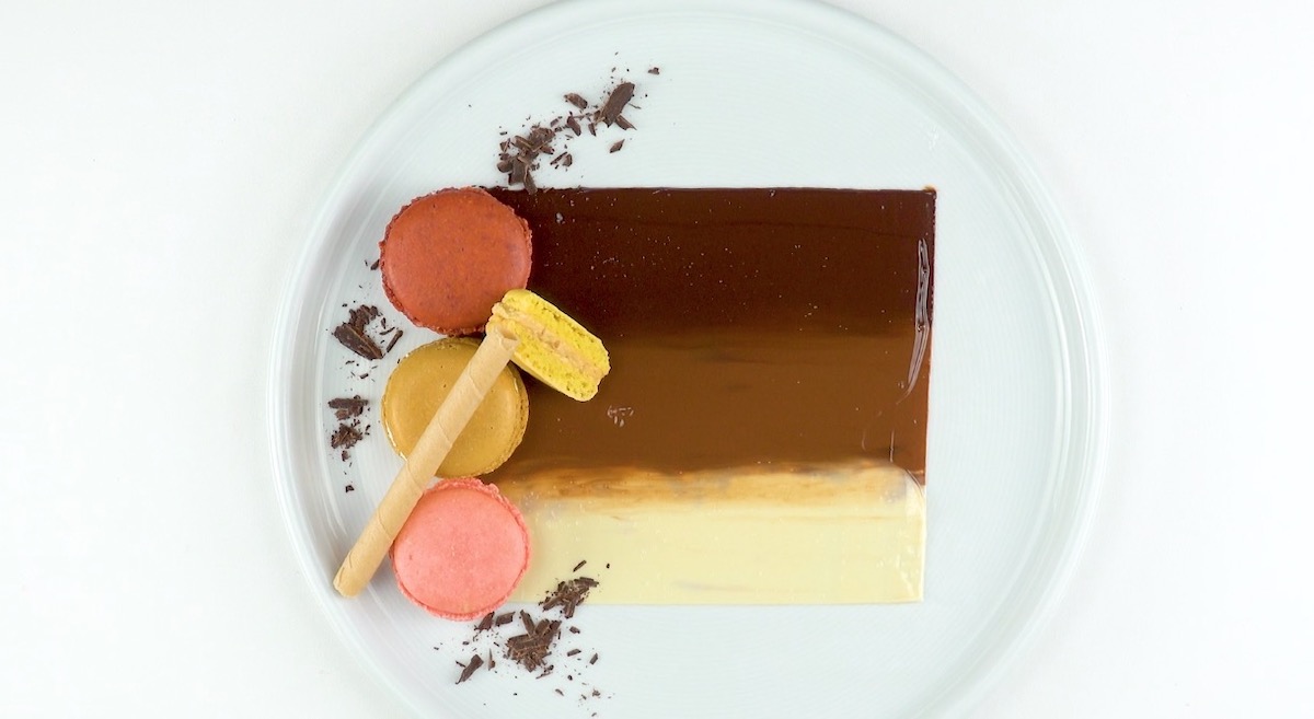 Schneide Wachspapier in Streifen und klebe ein Rechteck auf einen vorgewärmten Teller. Stelle diesen Teller kurz in die Mikrowelle und erwärme ihn erneut. Danach verteile jeweils einen Streifen mit gehackter weißer, dunkler und Vollmilchschokolade in dem aufgeklebten Rechteck. Warte, bis die Schokolade geschmolzen ist, und verstreiche sie von der einen zur anderen Seite. Lasse die Schokolade etwas fest werden und entferne dann das Wachspapier. Fertig ist der Teller zum weiteren Garnieren.