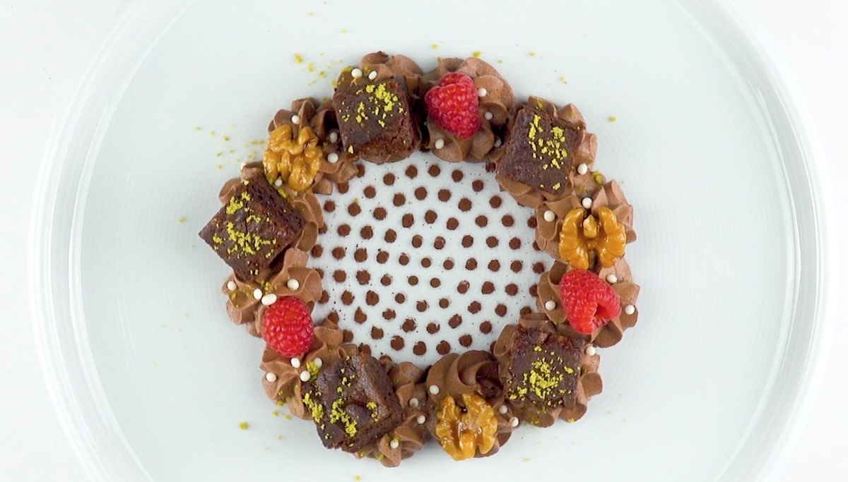 Halte eine Schaumkelle (12 cm Durchmesser) über einen Teller und siebe Kakaopulver darüber. Wische den äußeren Rand des Pulvers weg und garniere den Teller so weiter, wie du magst. Am besten eignen sich Beeren, Nüsse, Kekse oder kleine Gebäckstücke.