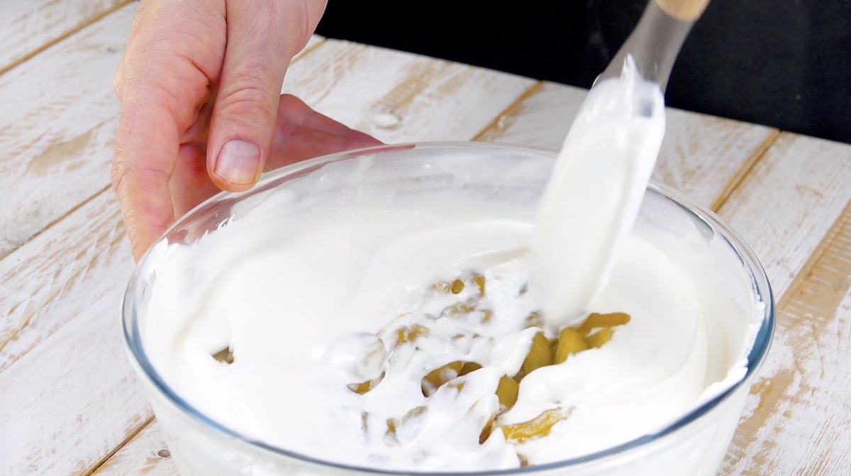 8.) Vermische 500 g Schlagsahne mit der restlichen Mascarpone-Creme und hebe das zuvor beiseitegestellte Maronen-Drittel unter.