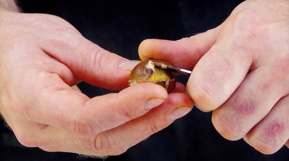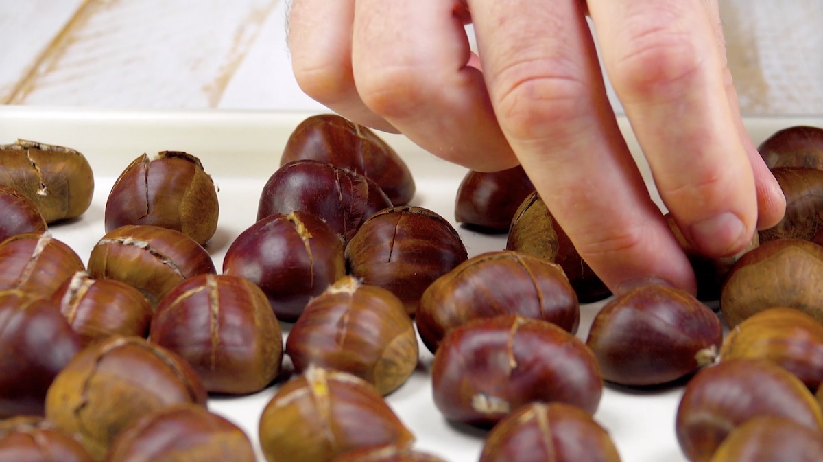 2.) Lass die Maronen kurz abkühlen, bis du sie anfassen kannst, und schäle sie dann.