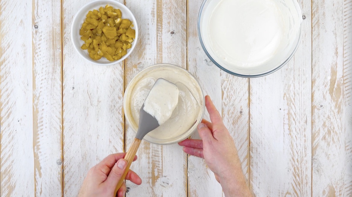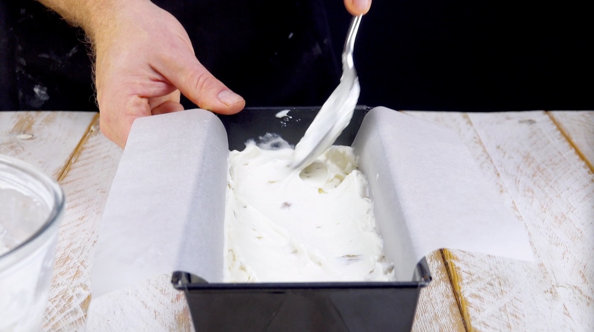 9.) Lege die Kastenform mit Backpapier aus und fülle sie zur Hälfte mit der Creme.