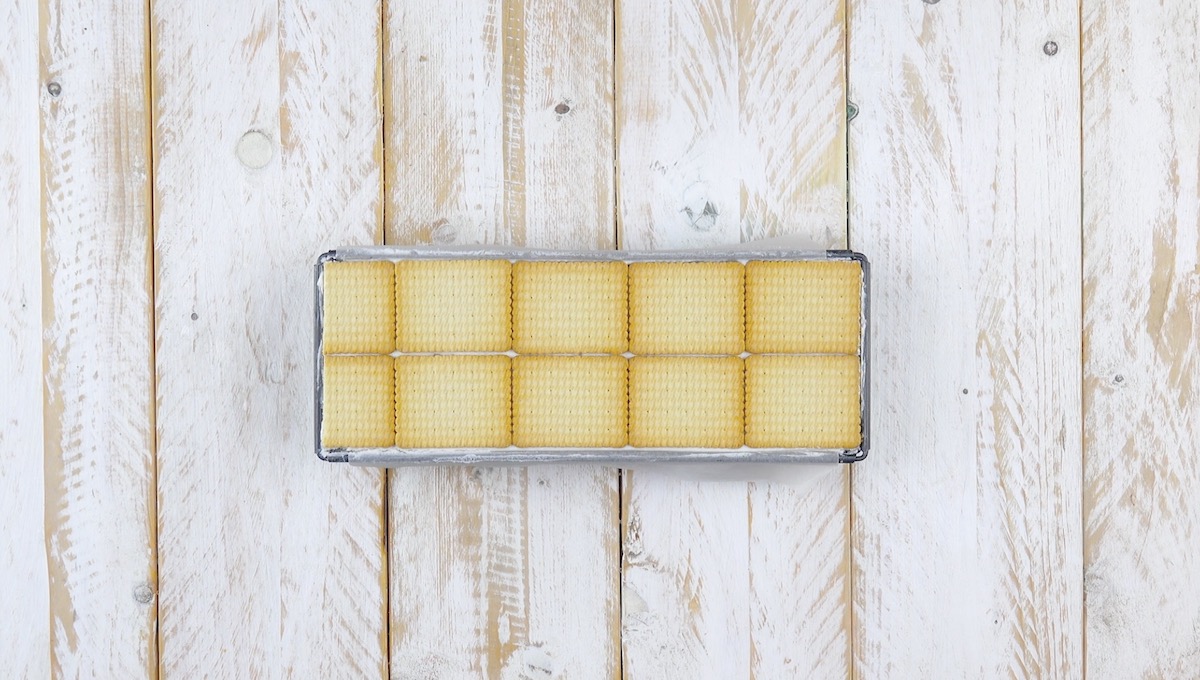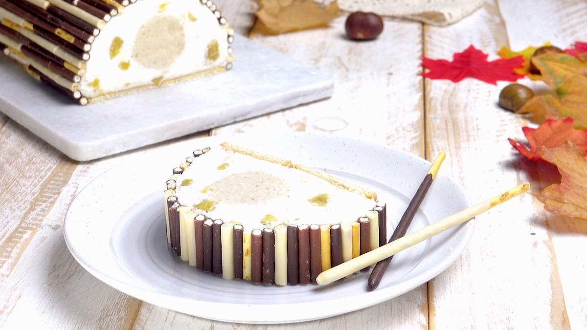 11.) Bedecke die gefrorene Maronen-Creme-Rolle mit der restlichen Creme und kröne das Ganze mit einer Schicht aus Butterkeksen; stelle das Dessert dann für 4 Stunden in den Kühlschrank.