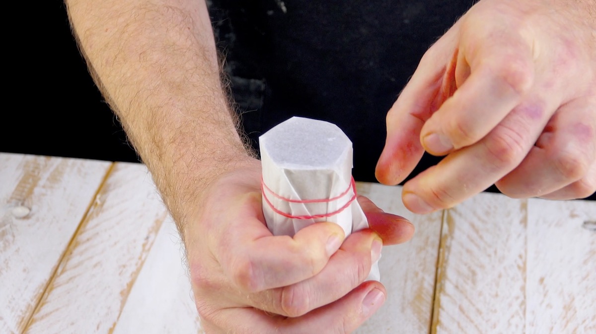 6.) Um eine Rolle zu erhalten, stecke einfach ein Stück Backpapier in die Pappe einer Küchenrolle. Verschließe die Rolle an einer Seite mit einem weiteren Stück Backpapier und einem Gummi.